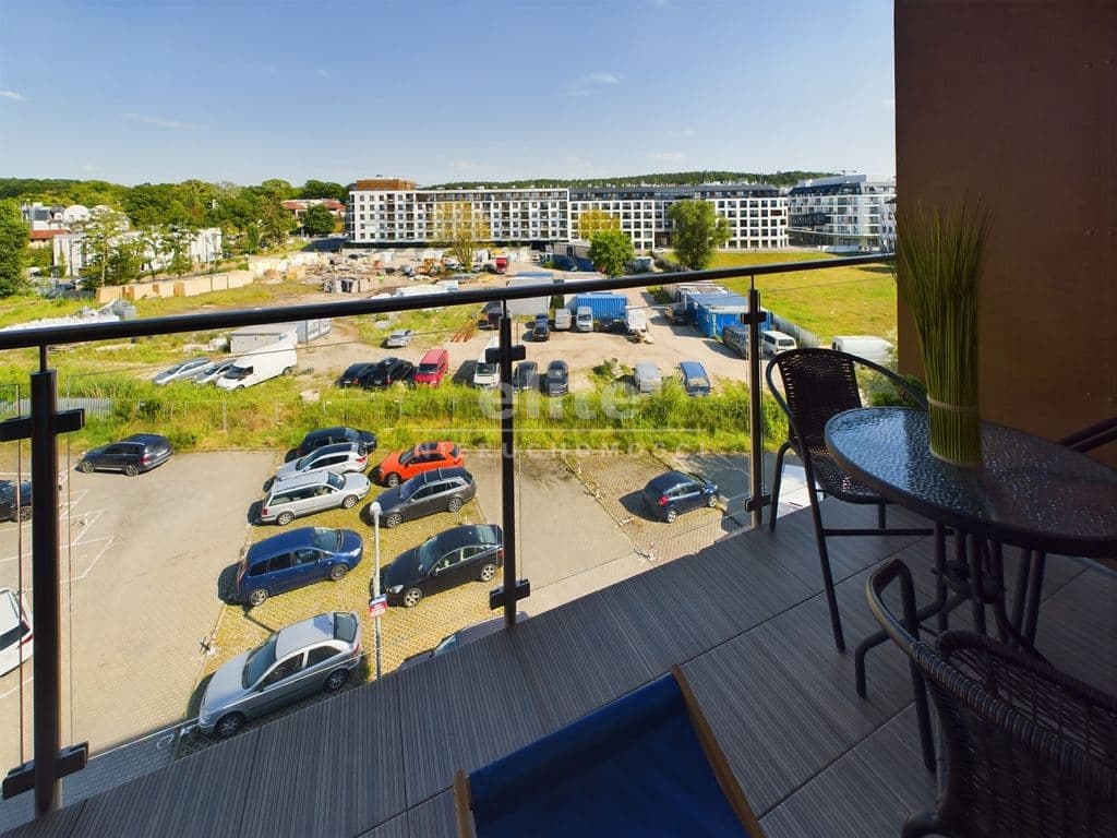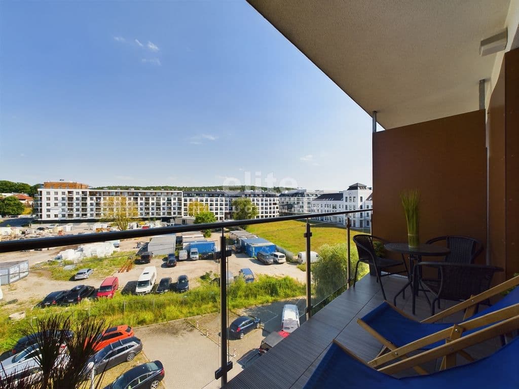 - Balkon tarasowy typu loggia: Przestronny balkon wyposażony w meble tarasowe oraz stolik. Oddzielona przestrzeń gwarantuje niezwykłą prywatność, umożliwiając relaks na świeżym powietrzu. Z balkonu rozpościera się przepiękny widok na ratusz, pobliski sklep Netto oraz w oddali zieleń drzew.