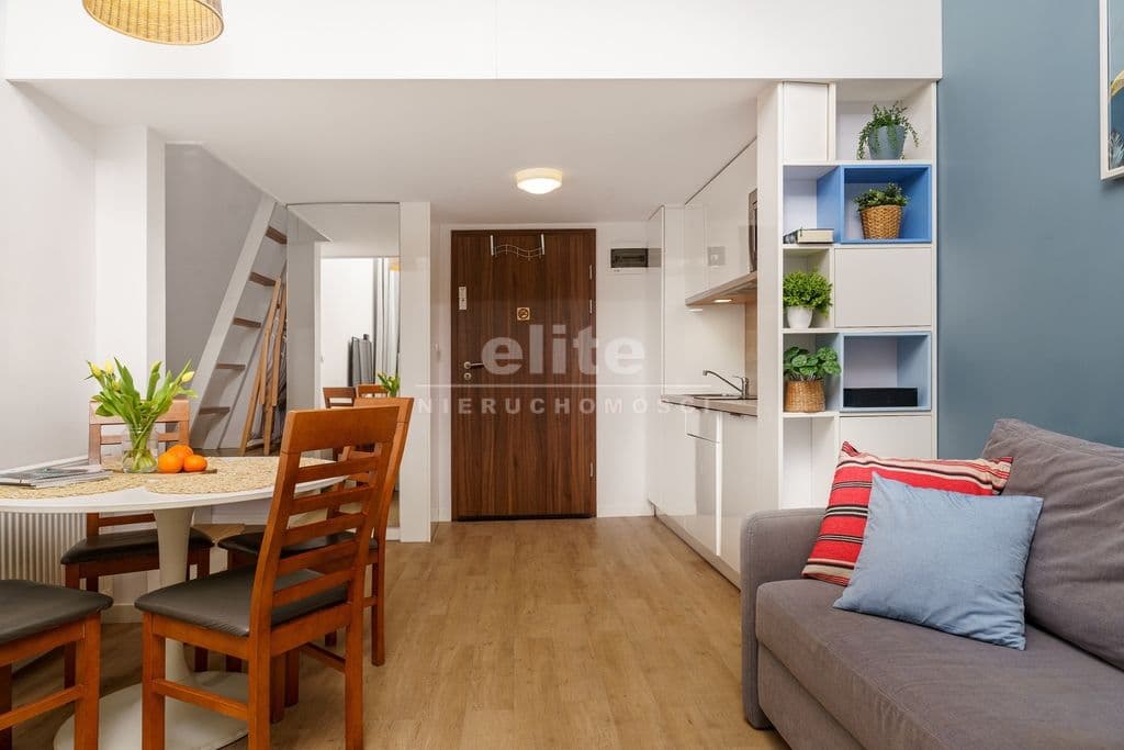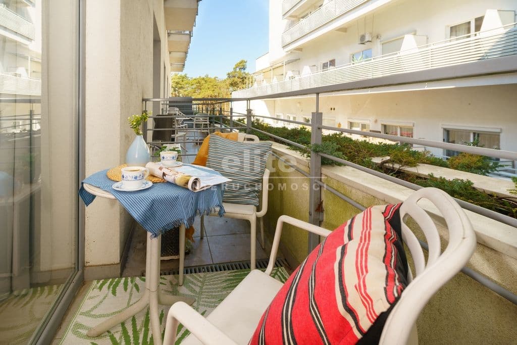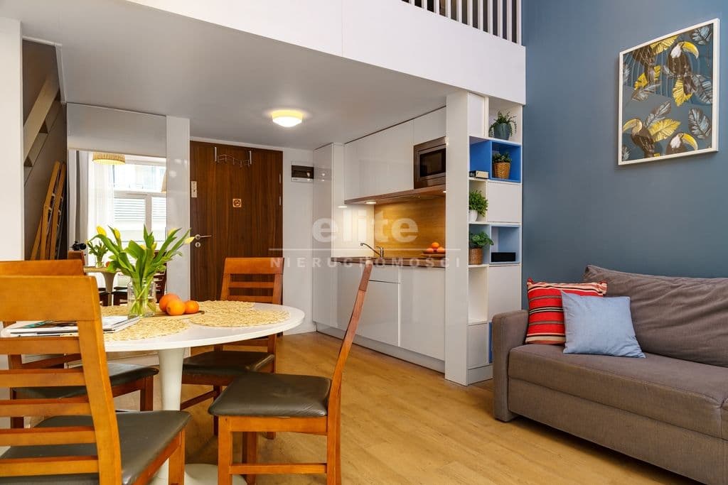 Funkcjonalne studio z antresolą zostało zaprojektowane z myślą o maksymalnym komforcie gości. Na antresoli znajduje się dwuosobowe łóżko oraz telewizor, natomiast w części dziennej – rozkładana sofa, stół z krzesłami oraz drugi telewizor. Lokal pomieści 4 osoby, co znacząco zwiększa jego potencjał najmu. Do dyspozycji jest również w pełni wyposażony aneks kuchenny (lodówka, płyta kuchenna, pochłaniacz i kuchenka mikrofalowa). Całość uzupełnia balkon z bocznym widokiem na morze.