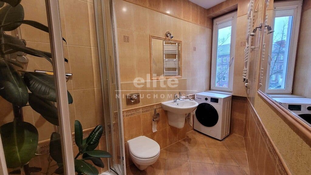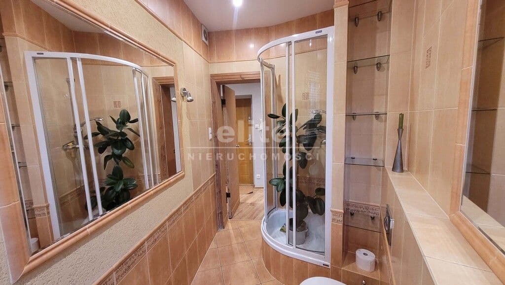 - łazienka w glazurze i terakocie, wyposażona w kabinę prysznicową,
