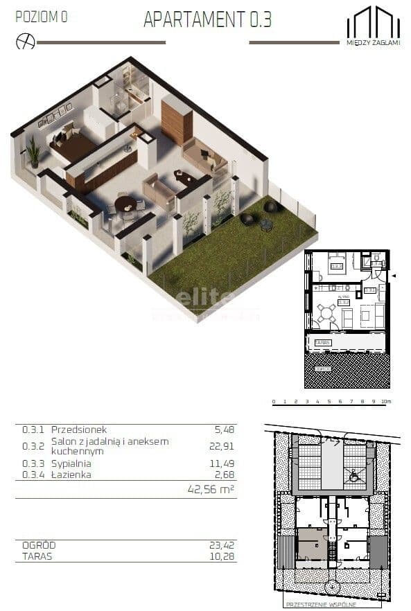 - AP.03 – 42,56 m² + galeria 10,28 m2 i ogród 23,42 m2