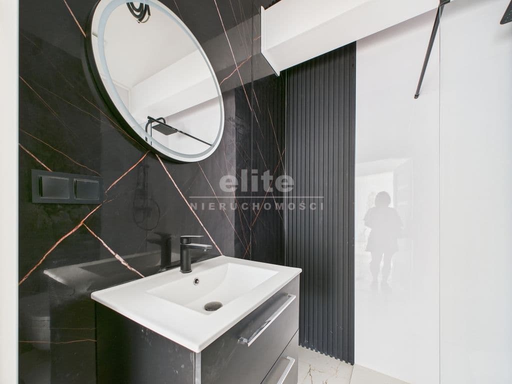 • nowoczesna łazienka: czarna armatura, duże lustro, stylowe wykończenie