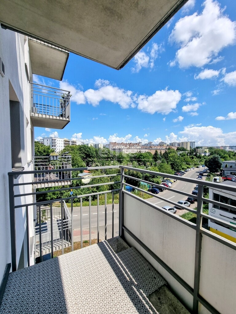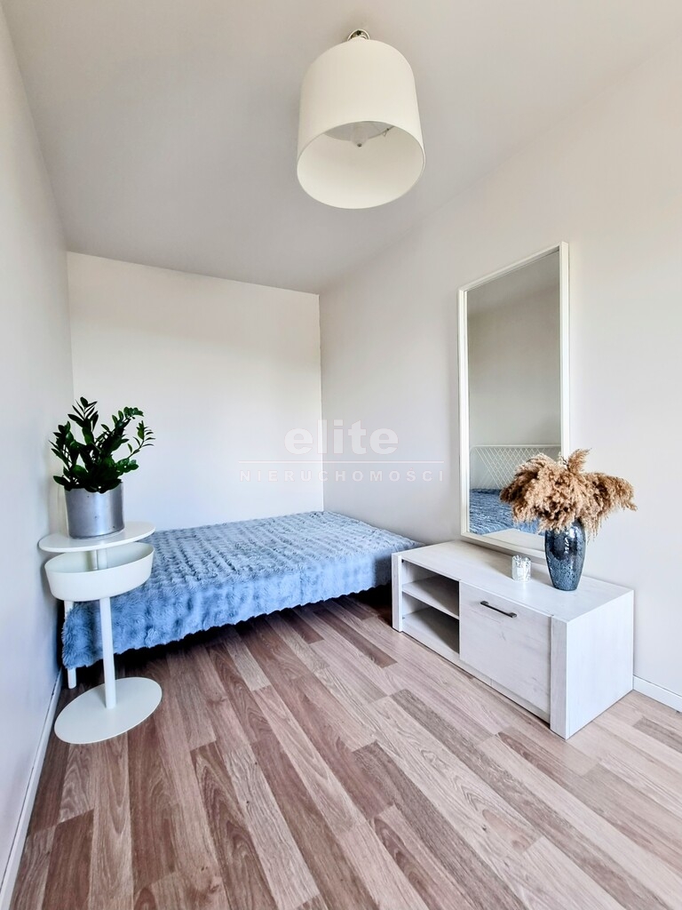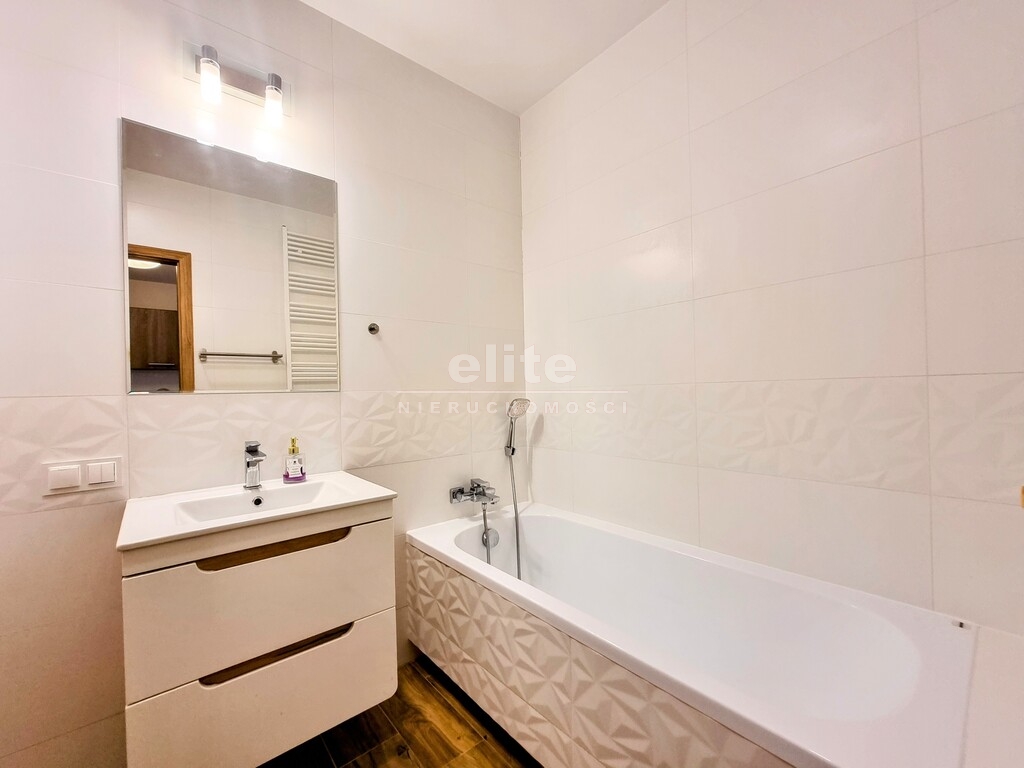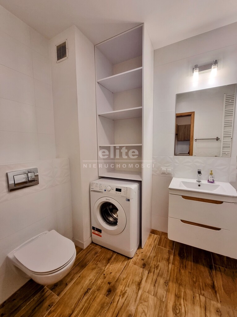 Kuchnia wyposażona w meble w zabudowie oraz sprzęt AGD: lodówka z zamrażalką, płyta grzewcza, okap, zmywarka, piekarnik. W łazience: wanna, umywalka, toaleta oraz miejsce na pralkę. W sypialni znajduje się w duże łóżko, komoda, lustro i sporo miejsca na szafę. Salon mieści kanapę, stolik kawowy oraz stół z krzesłami, a także kilka mebli do przechowywania. Z salonu również wyjście na balkon.