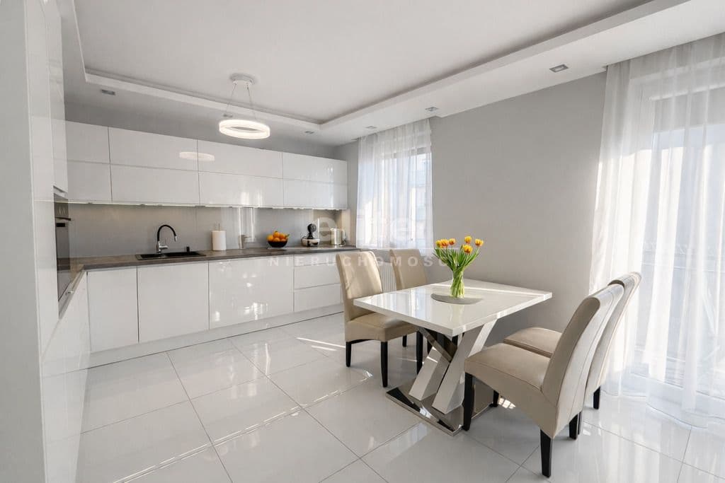 Centralnym punktem apartamentu jest elegancki salon połączony z aneksem kuchennym — przestrzeń reprezentacyjna, a zarazem niezwykle funkcjonalna. Kuchnia z zabudową wykonaną na zamówienie z wysokiej klasy materiału harmonijnie wpisuje się w całość wnętrza, tworząc spójną i ponadczasową kompozycję. Z salonu prowadzi wyjście na balkon, który stanowi idealne miejsce na poranną kawę lub wieczorny odpoczynek.