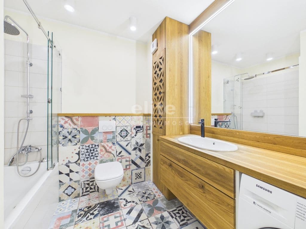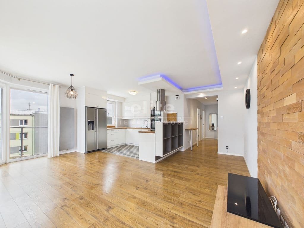 Mieszkanie zostało wykończone z materiałów wysokiej jakości, a w kuchni znajdują się funkcjonalne meble w zabudowie.