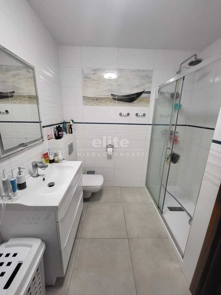 - Łazienka z prysznicem, wykończona w nowoczesnym stylu.