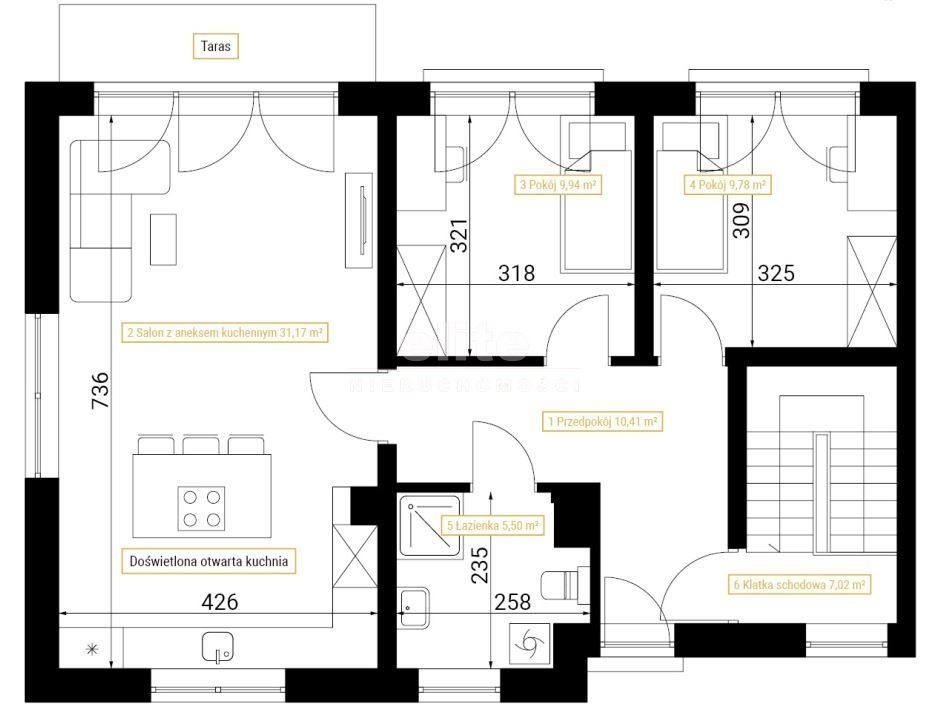 Na tej powierzchni znajduje się salon z otwartą kuchnią o około 30 m2 - wszystkie instalacje, jak sam budynek nowe. W kuchni poprowadzona siła pod montaż płyty indukcyjnej.