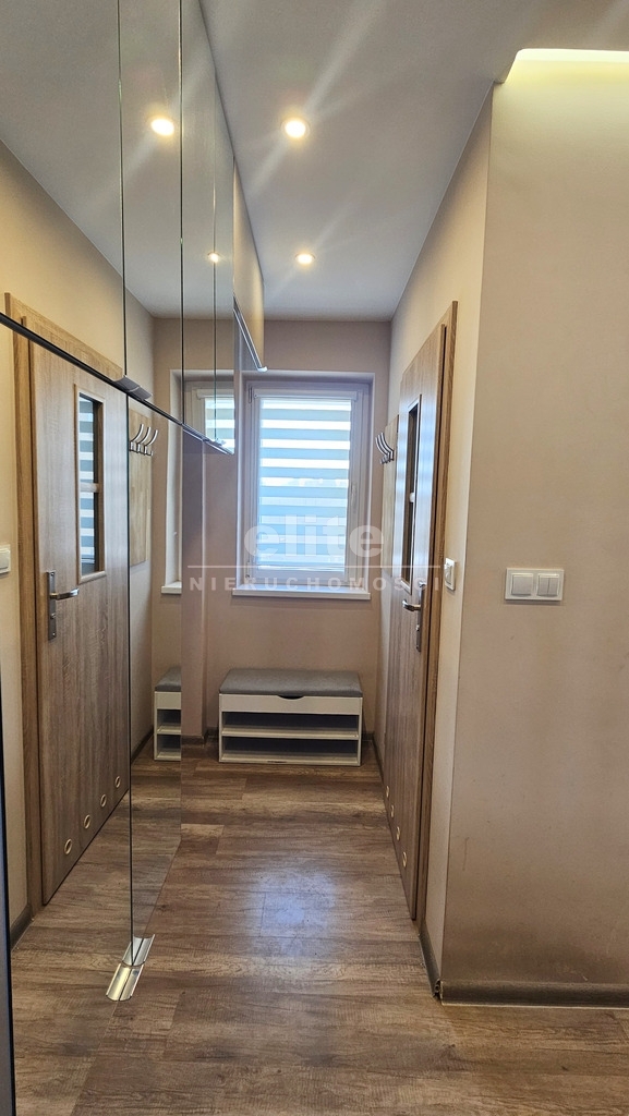 Salon jest miejscem, w którym można naprawdę odpocząć. Sprawdzi się zarówno na spokojne wieczory, jak i spotkania z bliskimi. Obok znajduje się sypialnia z dużą szafą w zabudowie, która porządkuje przestrzeń i pozwala zachować wnętrze w harmonii. Kuchnia jest w pełni umeblowana i wyposażona w sprzęt AGD – gotowa do użytku od pierwszego dnia. Całość uzupełnia łazienka z prysznicem oraz praktyczny korytarz