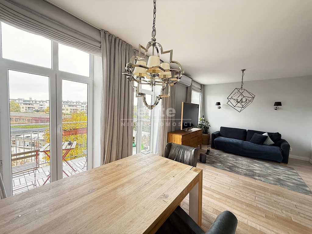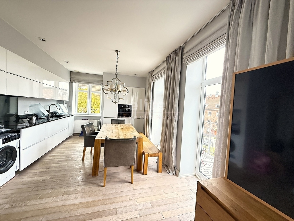 Salon połączony z kuchnią o powierzchni około 30m2 z wyjściem na słoneczny balkon.
