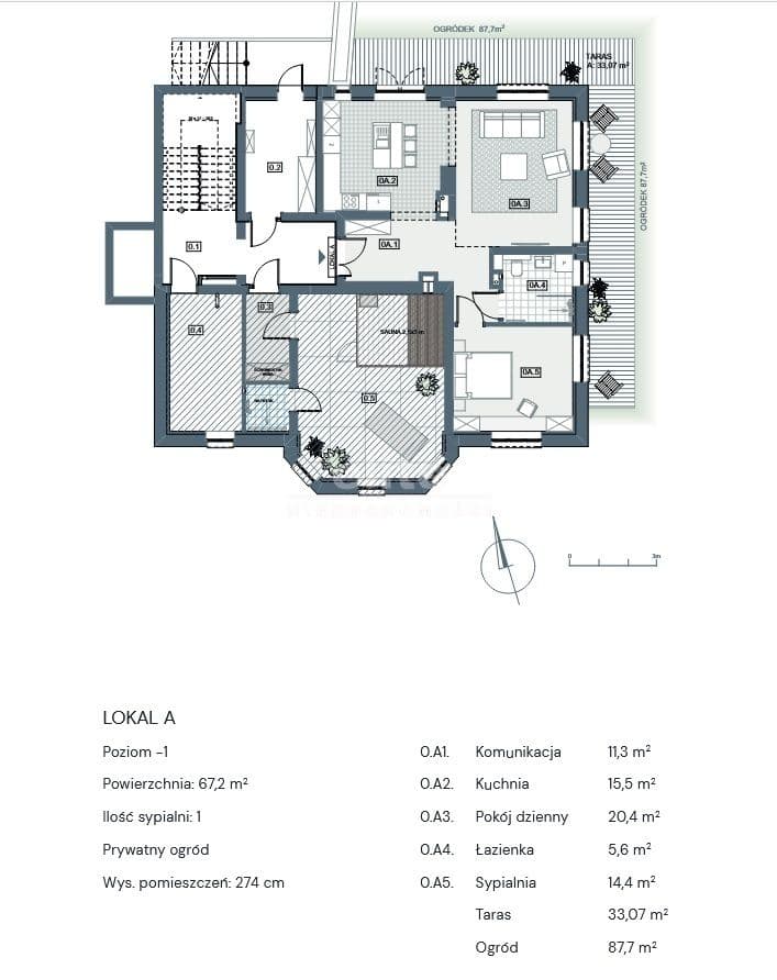 Przedstawiany apartament jest o powierzchni 67,87 m2 z tarasem o pow. 33,07 m2, znajduje się w przyziemiu i posiada przynależny ogródek o pow. 87,70 m2.