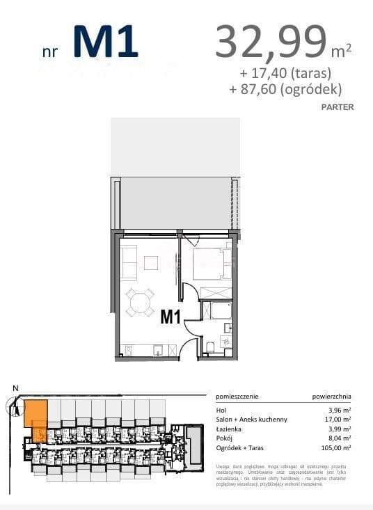- taras o pow. 17,40 m2 + ogródek o pow. 87,60 m2.