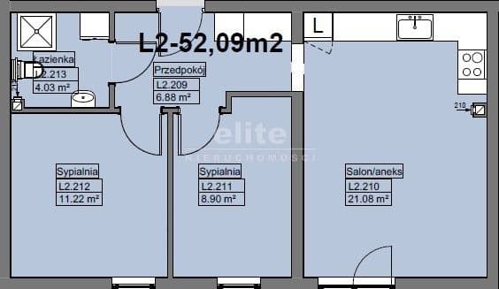 Lokal mieszkalny o pow. użytkowej 52,09 m2 składa się z następujących pomieszczeń: