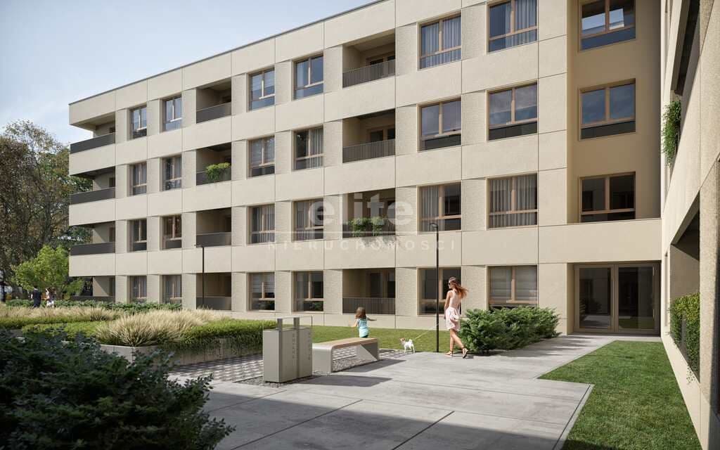 Piękna architektura budynku z nowoczesnym loggie zamiast balkonu, zagospodarowany, zielony teren z ogólnodostępnym dziedzińcem.