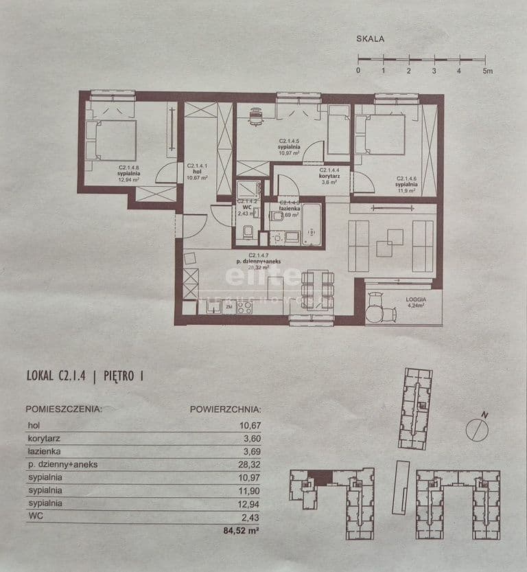 - Układ pomieszczeń: salon z aneksem kuchennym z wyjściem na loggie, 3 sypialnie, łazienka, hol, korytarz