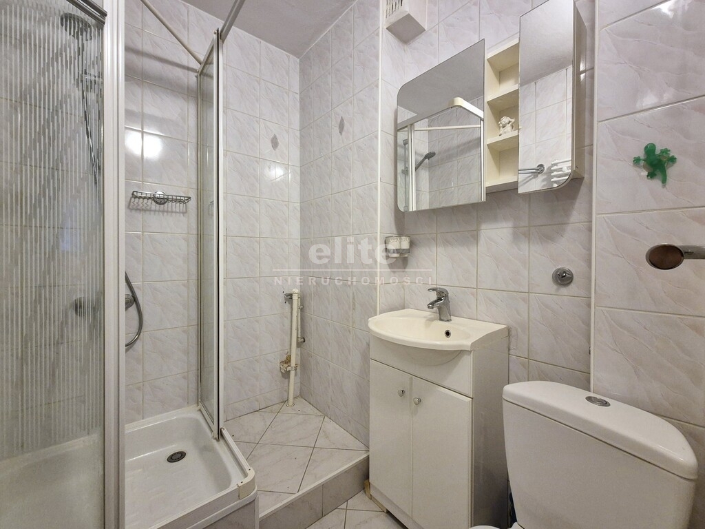 Łazienka bardzo dobrze utrzymana, z prysznicem, WC, umywalką oraz miejscem na pralkę.