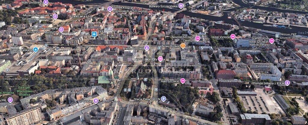 Mieszkanie w centrum przy Placu Zwycięstwa na skrzyżowaniu ulicy Bolesława Krzywoustego i Mikołaja Kopernika w odległości 400 metrów od Bramy Portowej. W najbliższej okolicy znajdują się przystanki komunikacji miejskiej (linie tramwajowe: 2, 3, 7, 8, 9, 10; autobusowe m.in. 61, 62, 75, 76, 87). Dookoła sklepy, galerie handlowe, restauracje, punkty handlowe i usługowe, przychodnie, apteki, kino, puby, banki, a także szkoły, przedszkola oraz wydziały wielu uczelni wyższych.
