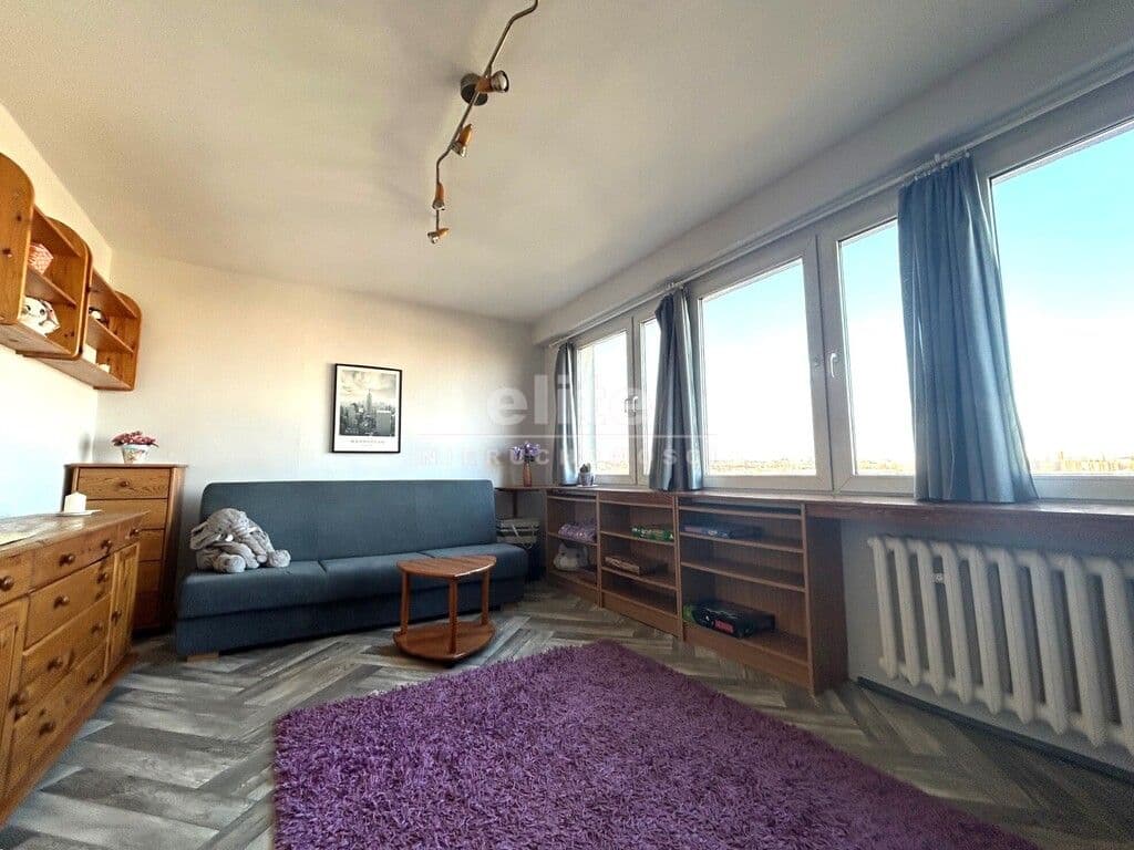- pokój dzienny (w pełni umeblowany: rozkładana kanapa, szafki, stolik kawowy), cała ściana z oknami z których rozpościera się widok na panoramę miasta,