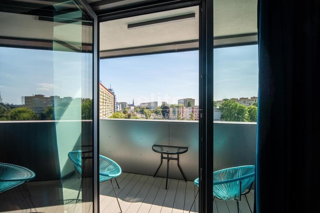 Pokój dzienny wyposażony w duże kontynentalne łóżko, TV oraz meble, z wyjściem na duży balkon o powierzchni 5,88 m2 z widokiem na al. Wyzwolenia w Szczecinie.