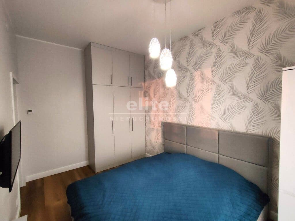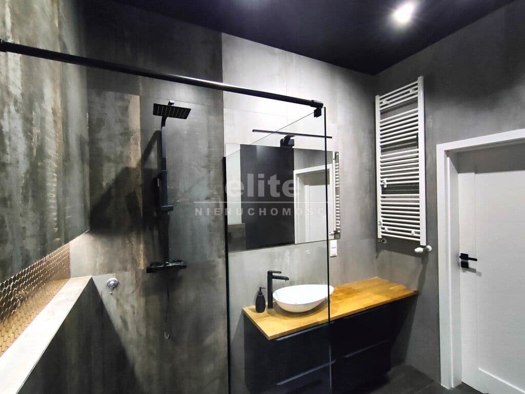 Kuchnia została wykonana z dbałością o funkcjonalność i estetykę — drewniana zabudowa, czarne detale i dobrze rozplanowane oświetlenie tworzą elegancką całość. Sypialnia, oddzielona od salonu, zapewnia prywatność i również posiada wyjście na loggię, co optycznie powiększa przestrzeń.