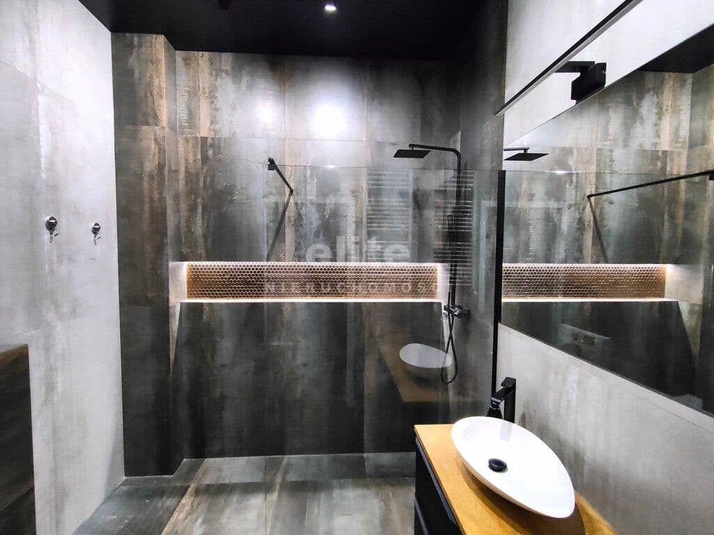 Łazienka w standardzie premium: wielkoformatowe płyty o industrialnym charakterze, czarna armatura, prysznic typu walk-in oraz podświetlane wnęki nadają wnętrzu nowoczesny i minimalistyczny styl.