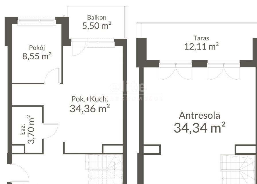 ~ Salon z kuchnią 34,36 m2- z którego przedostać się można do pokoju, łazienki i na balkon