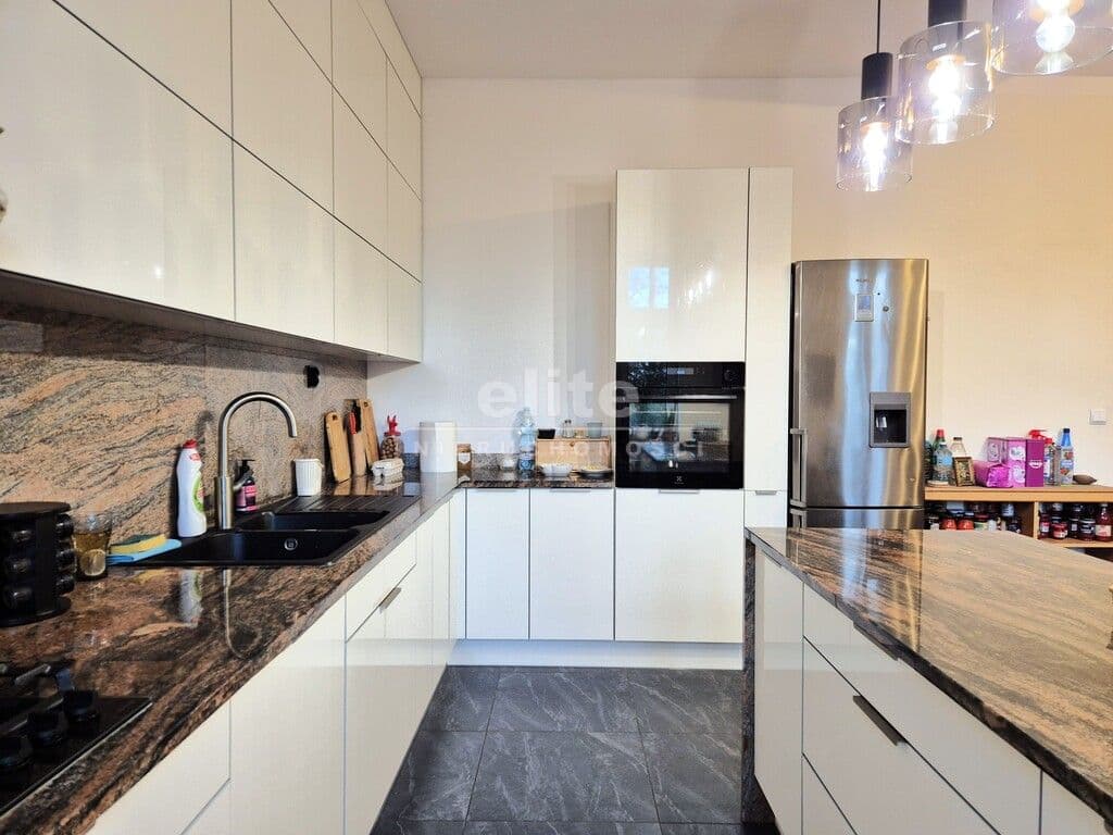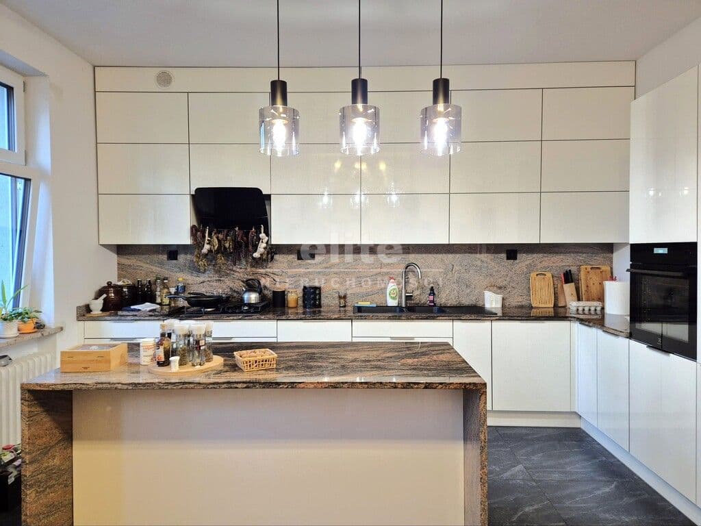 * kuchnia z meblami w zabudowie na wymiar koloru białego z granitowymi blatami i wyspą, wyposażona w sprzęt AGD: piekarnik, lodówkę z zamrażarką, płytę gazową, okap z wyciągiem oraz zmywarkę. Kuchnia to przestronne i jasne pomieszczenie połączone z jadalnią, gdzie obecnie znajduje się duży drewniany stół z 6 krzesłami.