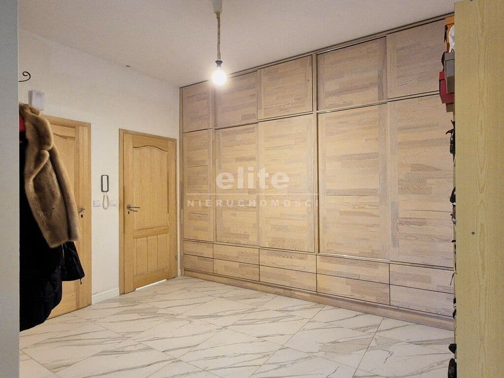 * funkcjonalny przedpokój z dużymi, drewnianymi szafami w zabudowie