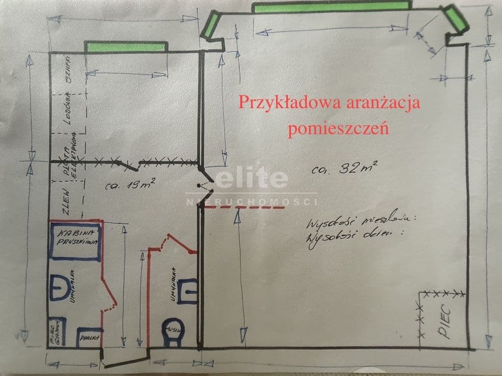 - Układ: 2 duże pomieszczenia do dowolnej aranżacji
