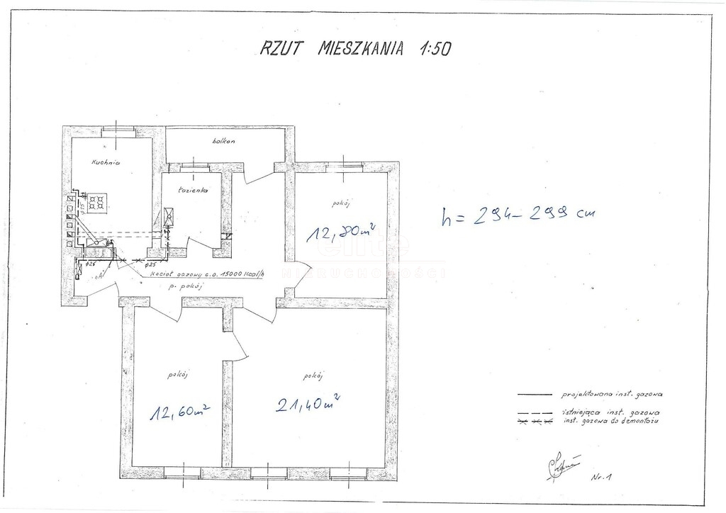Powierzchnia pokoi: 21,40 / 12,80 / 12,60mkw, wysokość pomieszczeń ok 295cm.