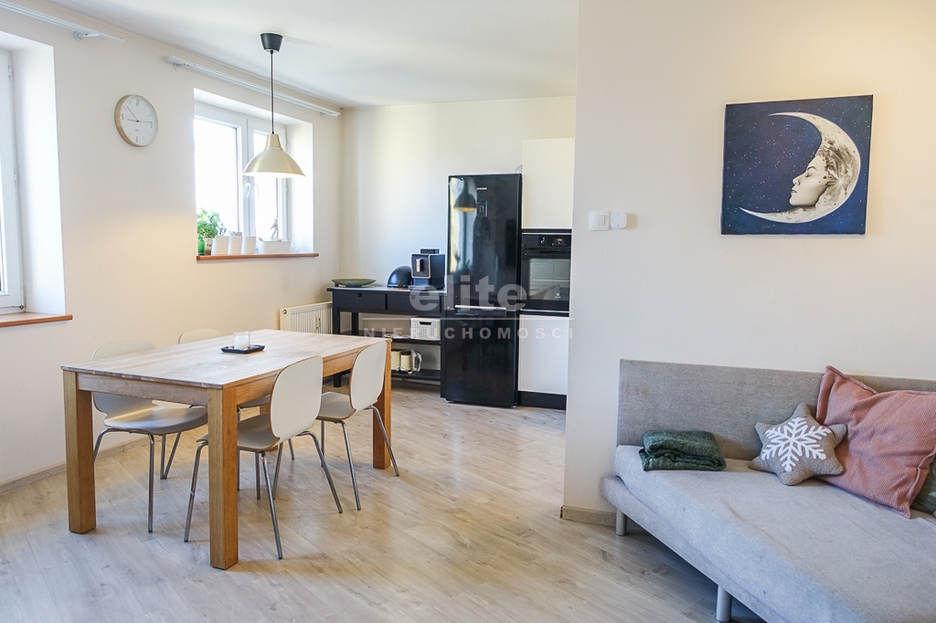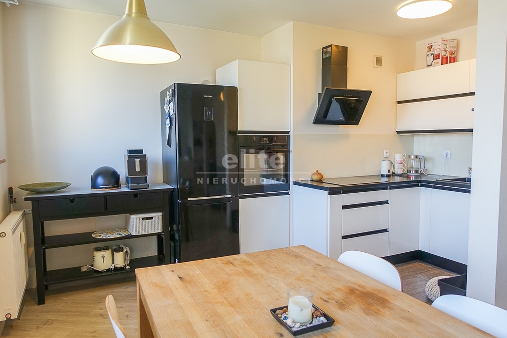 Kuchnia ma własne okno i można wrócić do poprzedniego układu stawiając ściankę. Kuchnia umeblowana i urządzona. Zabudowa meblowa biała, nowoczesna, sprzęt AGD: zmywarka, płyta indukcyjna, piekarnik elektryczny wbudowany, zlewozmywak jednokomorowy, pochłaniacz, lodówka wolno stojąca.