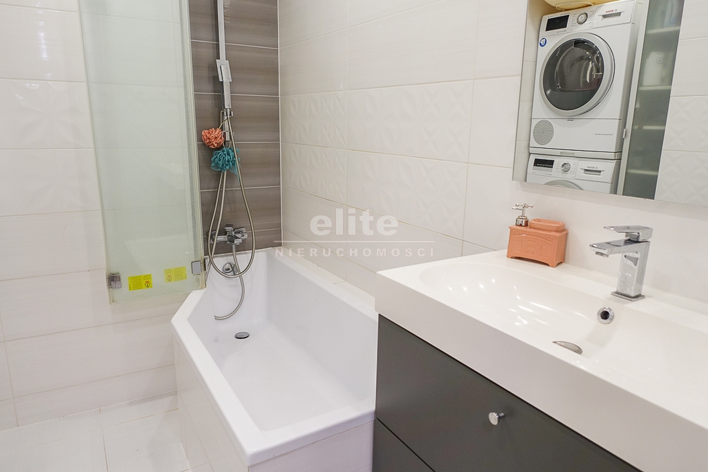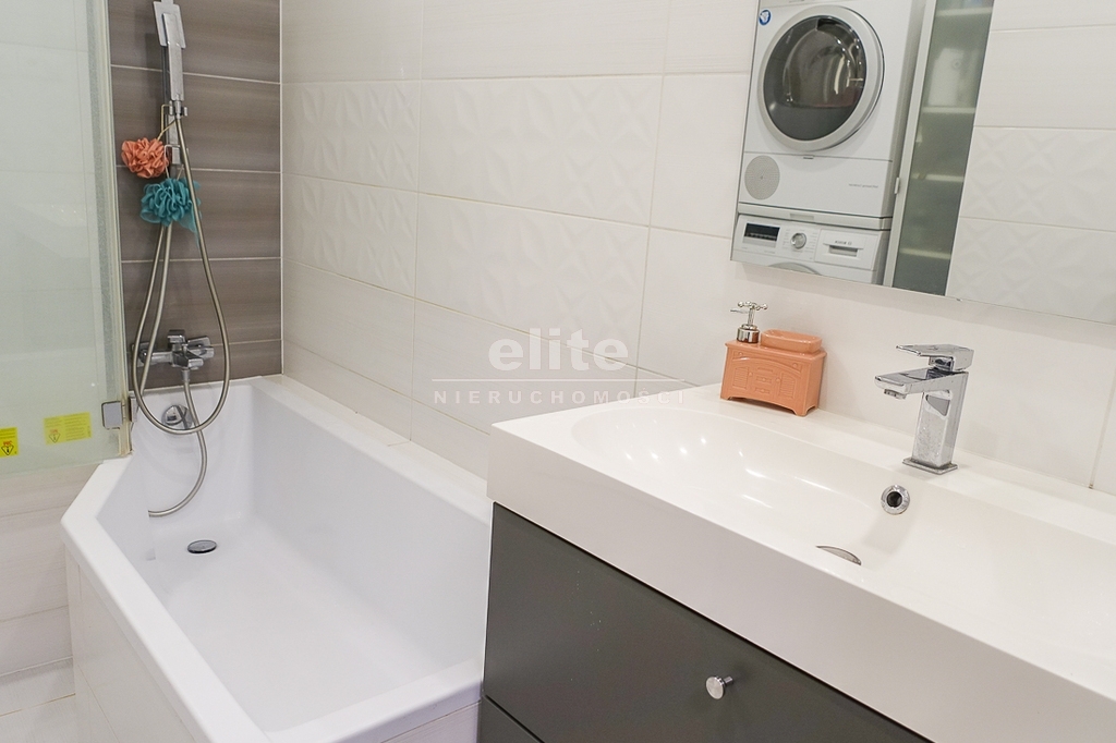* łazienka ok. 6 m2 z wanną, umywalką, pralką i suszarką pozostającymi w mieszkaniu.