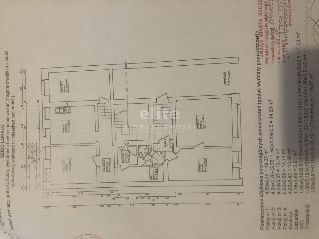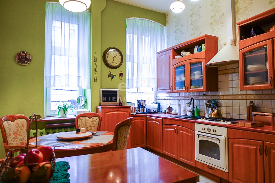Pokoje 19,37 m2, 14,29 m2, 13,78 m2 i 14,71 m2. Kuchnia oddzielnie prawie w kwadracie o powierzchni 14 m2 z zabudową meblową i urządzeniami AGD (lodówka, zmywarka, okap, piekarnik, płyta ceramiczna). Łazienka po remoncie o powierzchni 3 m2 z nową kabiną prysznicową, nowymi płytkami ceramicznymi oraz umywalką z szafką i miejscem na pralkę. WC oddzielnie po remoncie o pow. 1,05 m2 z umywalką. Przedpokój 16,97 m2. W przedpokoju, kuchni, łazience i WC na podłogach terakota. W pokojach pod panelami parkiet w największym pokoju, w pozostałych pokojach deska. Drzwi oryginalne, drewniane. Nowe okna PCV. Jedno z okien bardzo ciekawe, skrzynkowe. Z dwóch pokoi widok na park od strony południowej, sypialnia, pokój i kuchnia od strony cichego, zadbanego podwórka od strony północnej. W przedpokoju i kuchni nowa instalacja elektryczna.
