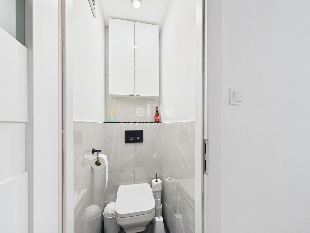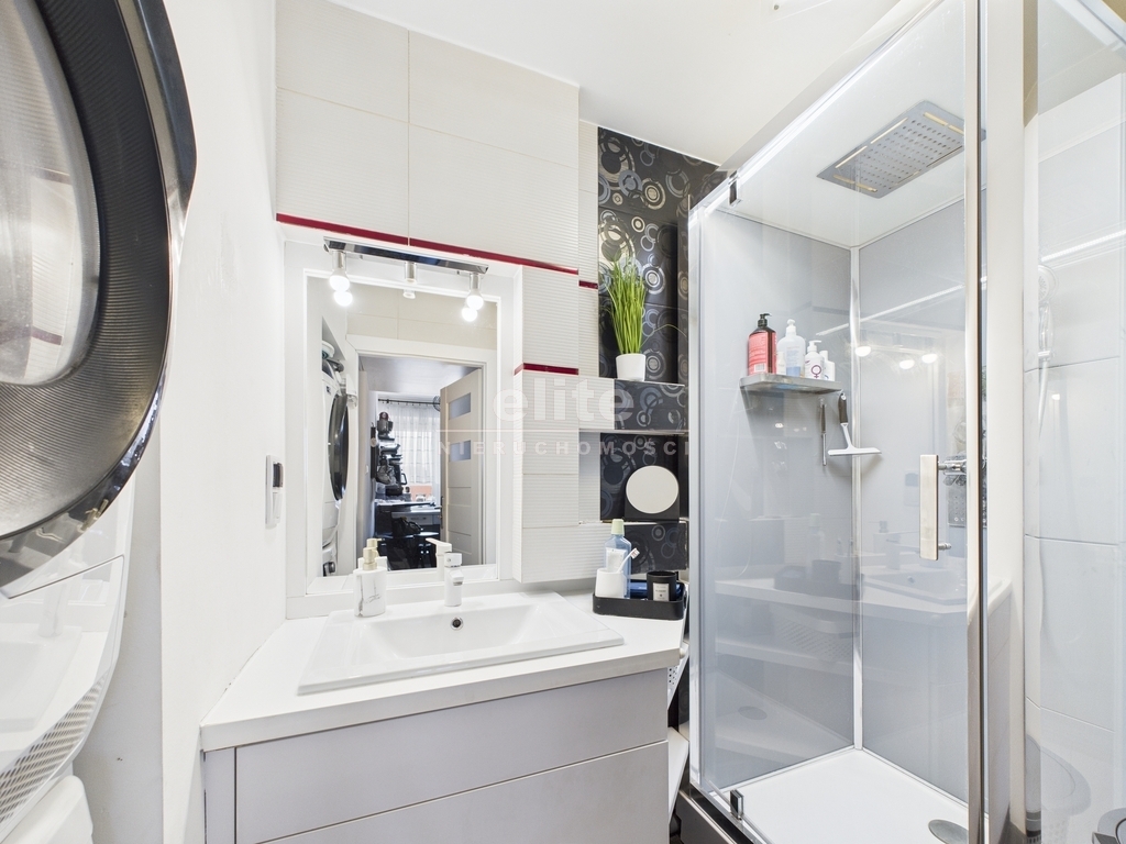 - Łazienka z kabiną prysznicową z hydromasażem, pralką oraz suszarką