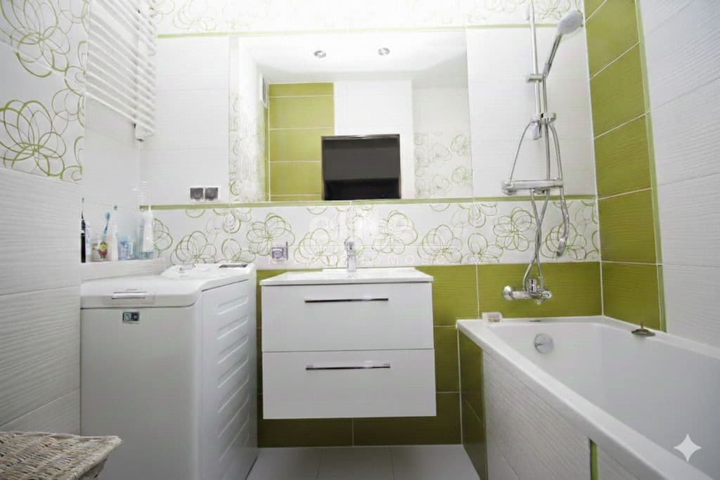 * łazienka z wanna oraz pralka ,