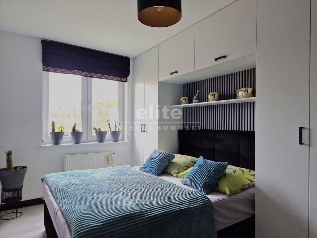 - sypialnia z dużym podwójnym łóżkiem i zabudową na wymiar mieszczącą także szafy, drzwi przesuwne oszczędzające miejsce