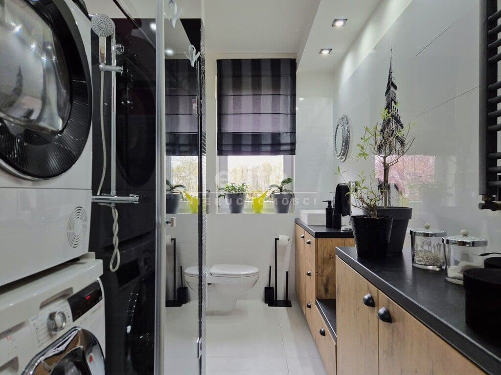 - łazienka z oknem wyposażona w prysznic, WC podtynkowe, osobną pralkę i suszarkę oraz sporo dodatkowego miejsca na przechowywanie w szafkach wokół umywalki