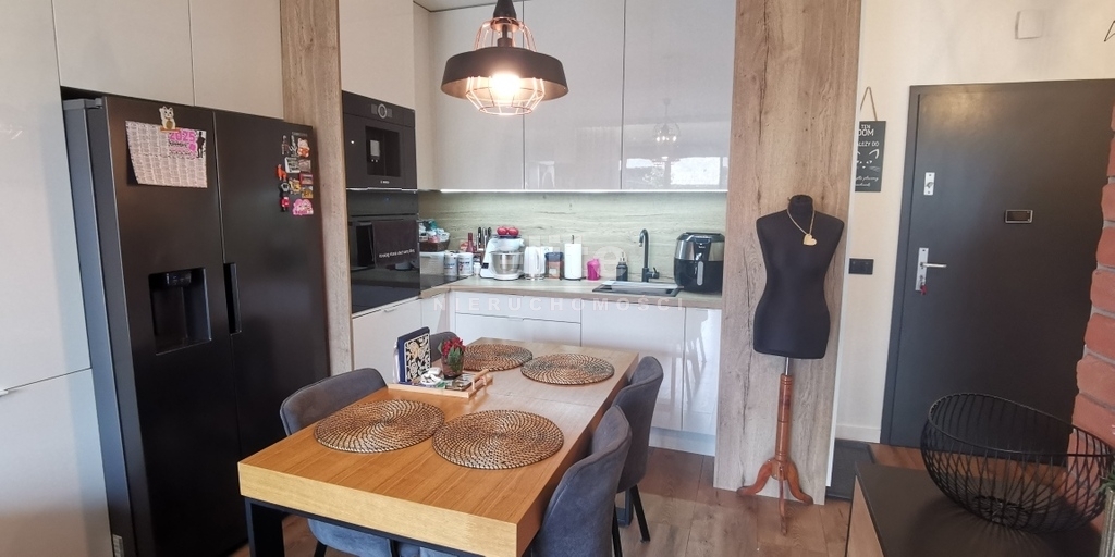 - aneks kuchenny, połączony z pokojem dziennym, z zabudową mebli kuchennych, pełnym wyposażeniem w sprzęt AGD (lodówka 2-skrzydłowa z kostkarką do lodu) Samsung, piekarnik dwustrefowy Samsung, ekspres do kawy wbudowany z funkcją wifi Bosch, okap, zlewozmywak.