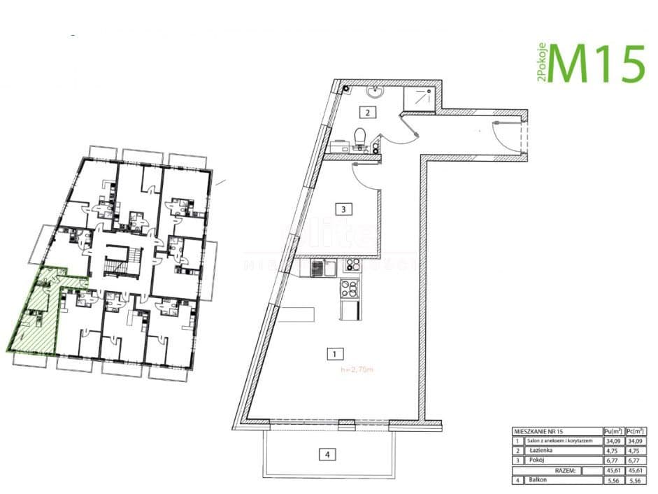 Prezentowany lokal mieszkalny ma powierzchnię 45,61 m2 i składa się z dwóch rozkładowych pokoi w tym jeden w aneksie kuchennym z wyjściem na obszerny balkon 5,56 m2 (34,09/6,77 m2) oraz łazienki 4,75 m2.