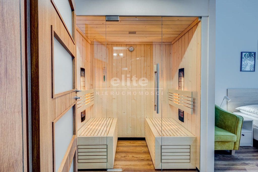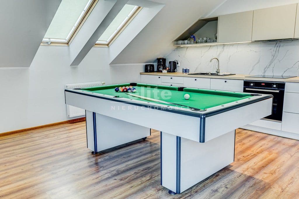 Apartament jest pięknie zaprojektowany oraz komfortowo wykończony i wyposażony m.in. w saunę, wannę z hydromasażem, stół bilardowy.