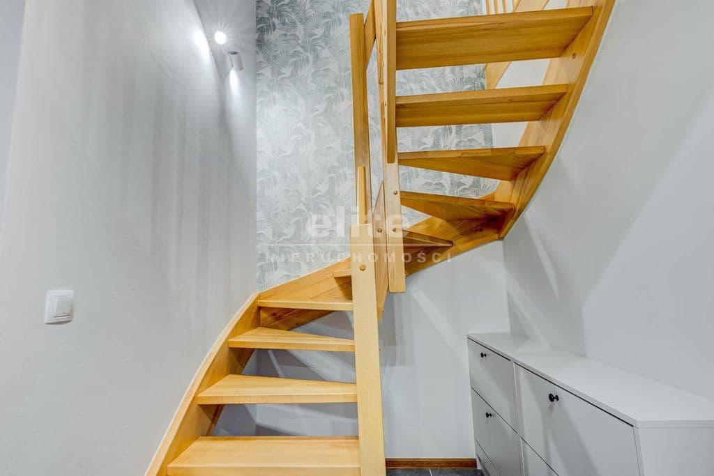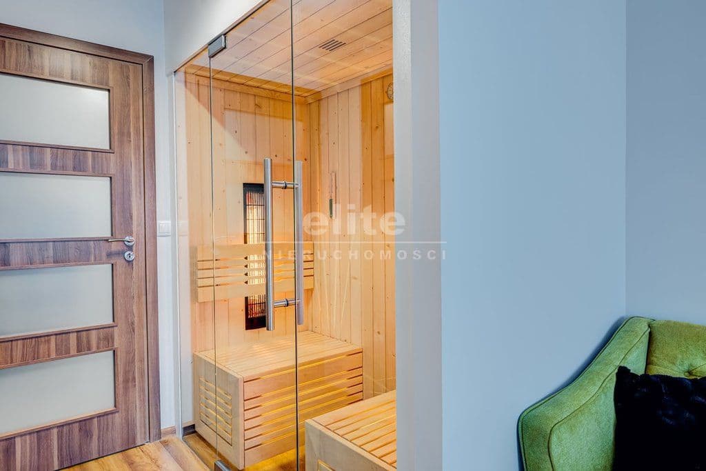 - na 1. poziomie przedpokój z szafą w zabudowie i szafkami na obuwie, holl, sauna na podczerwień, sypialnia z balkonem, łazienka z wc,