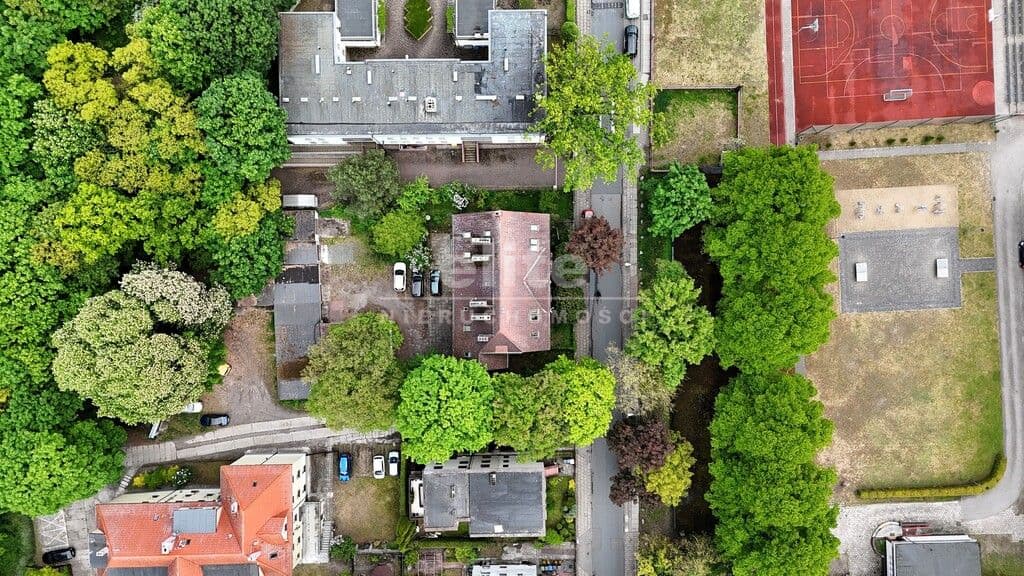 * kameralna, dwupiętrowa kamienica w otoczeniu zieleni
