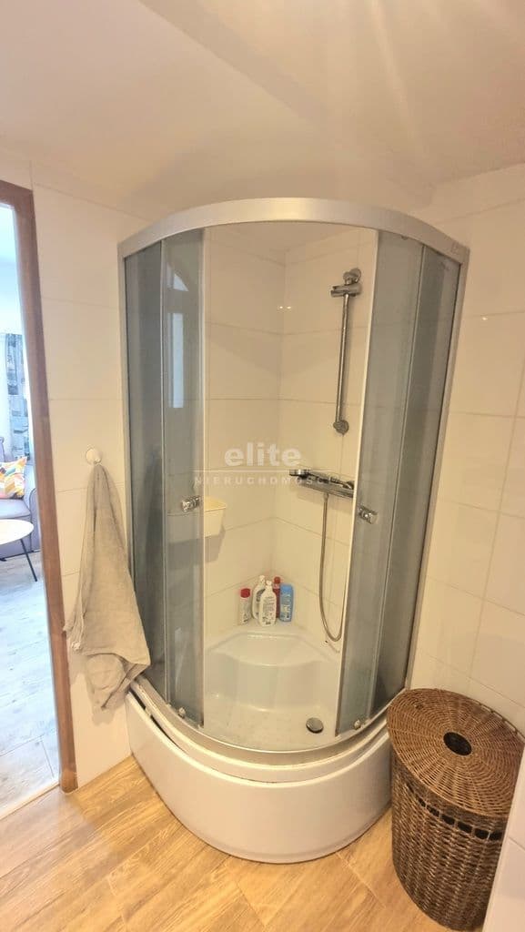 - łazienka: nowoczesna, z wygodną kabiną prysznicową, wyposażona w pralkę i suszarkę, co znacząco ułatwia codzienne życie.