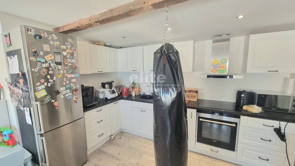 - Kuchnia: Gustowna zabudowa na wymiar wyposażona w wysokiej klasy sprzęt AGD (piekarnik, płyta indukcyjna, zmywarka, okap) – idealna dla miłośników gotowania.