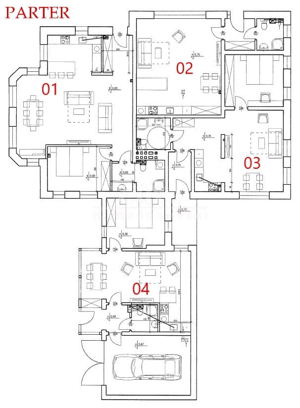 z garażem w bryle budynku (nr. 4) * mieszkania na parterze z osobnymi wejściami z dworu, dodatkowo jedno z nich