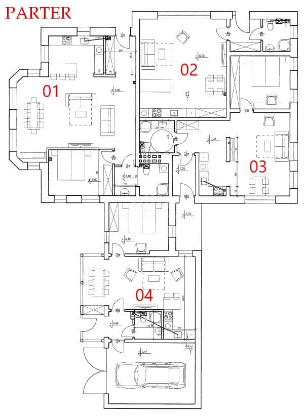 * 1- lub 2- pokojowe, z kuchnią w formie aneksu i łazienką, niektóre z balkonem (nr. 5 i 6) lub antresolą (nr. 13) a jedno z garażem w bryle budynku (nr. 4)