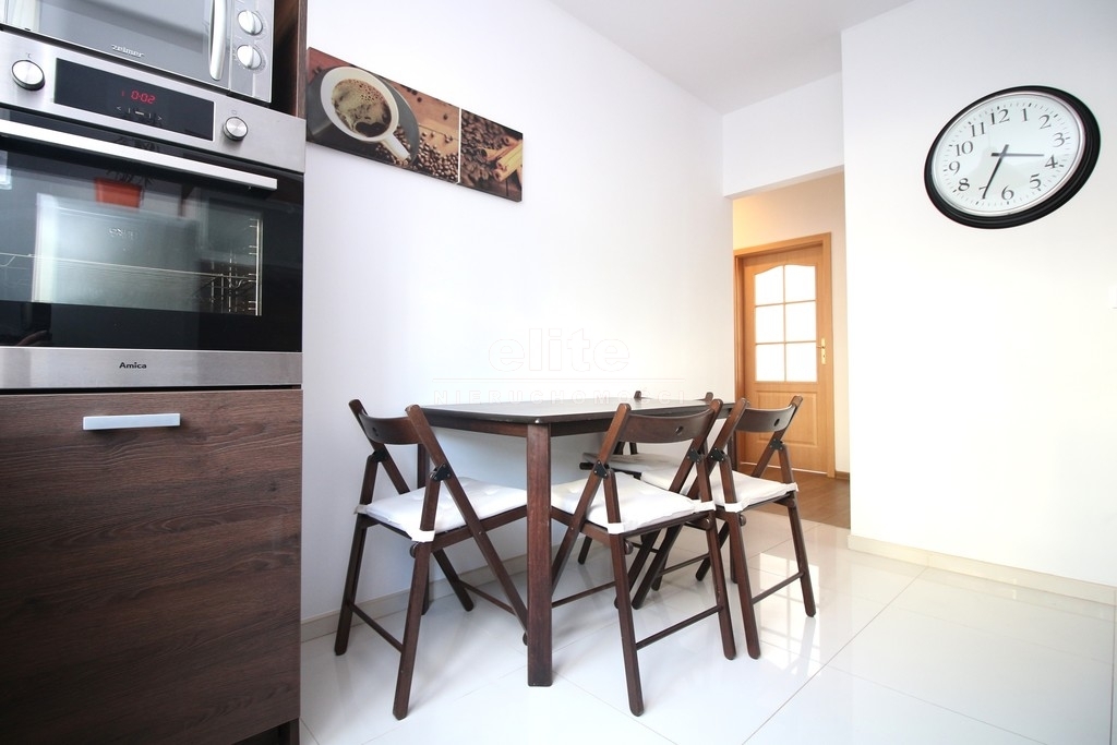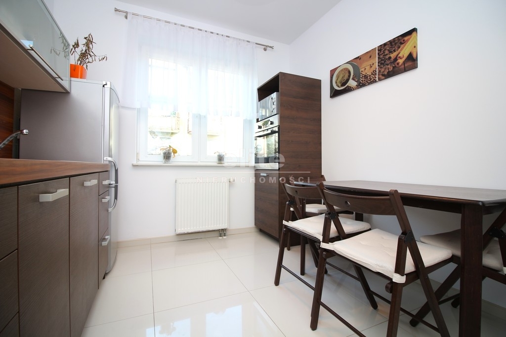 • widna kuchnia w zabudowie meblowej, z pełnym wyposażeniem AGD (lodówka, zamrażarka, piekarnik, mikrofalówka, płyta indukcyjna, okap)