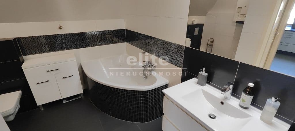 - łazienka z wc wyposażona w dużą wannę, grzejnik drabinkowy oraz miejsce na pralkę,