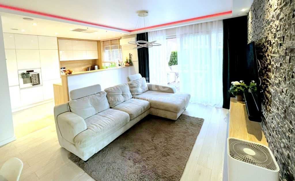 Oferujemy do sprzedania przestronny i słoneczny apartament z tarasem oraz dużym ogrodem (133 m2), znajdujący się na parterze niskiego budynku z 2016 roku, usytuowany na nowoczesnym osiedlu w atrakcyjnym zakątku Warzymic. Na powierzchnię 69,31 m2 składa się słoneczny salon z aneksem kuchennym, wyjściem na taras i ogród, dwie sypialnie, łazienka z WC oraz korytarz. Atutem nieruchomości - sporych rozmiarów ogródek (o powierzchni 133m2) z zaaranżowanym - dużym, drewnianym tarasem. Dodatkowo, na ogródku basen oraz piaskownica dla dzieci. Poczucie intymności zapewniają wysokie nasadzenia (ponad 2 m tuje) z zainstalowanym automatycznym systemem nawadniania (woda ogrodowa, sterowane aplikacją). Standard mieszkania - bardzo wysoki. Lokal wykończono i wyposażono materiałami oraz sprzętem klasy premium. W całym apartamencie zainstalowano wodne ogrzewanie podłogowe z elektronicznymi termostatami w każdym pomieszczeniu, sterowane zarówno ręcznie jak i przez aplikację. W oknach elektrycznie sterowane rolety zewnętrzne. Dodatkowym atutem, wysokowydajna klimatyzacja firmy mitsubishi heavy industries (chłodząco/grzewcza w klasie A++). Kuchnia wyposażona w bardzo wydajny wyciąg (1200m3 na godzinę). Apartament posiada także i garderobę. W cenie nieruchomości - całość umeblowania, w tym w zabudowie oraz sprzęty RTV/AGD widoczne na zdjęciach. Osiedle na którego terenie znajduje się nieruchomość, bardzo zadbana, ogrodzona, z ogólnodostępnym parkingiem, dużą ilością zieleni, alejkami spacerowymi, wydzielonymi i ogrodzonymi strefami zabaw dla dzieci. W pobliżu m.in. markety, sklepy, szkoła, przedszkole. W odległości około 5 kilometrów granica polsko - niemiecka (Kołbaskowo i Rosówek) oraz autostrada A6.
