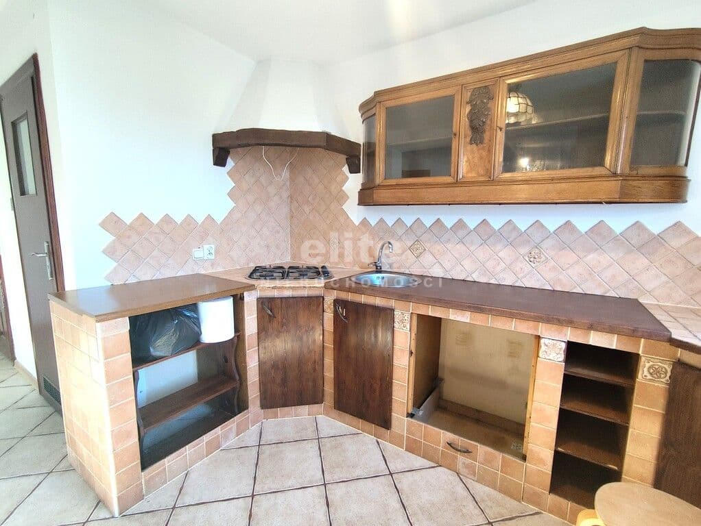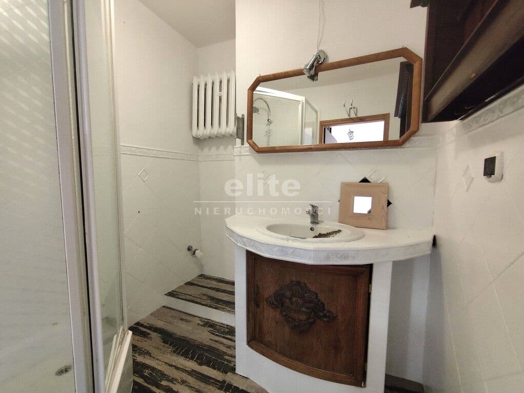 Przedpokój z szafą z lustrem oraz otwarta, klimatyczna kuchnia nadają wnętrzu przestrzeni. Drewniane detale w łazience pasują do obecnego wykończenia kuchni.