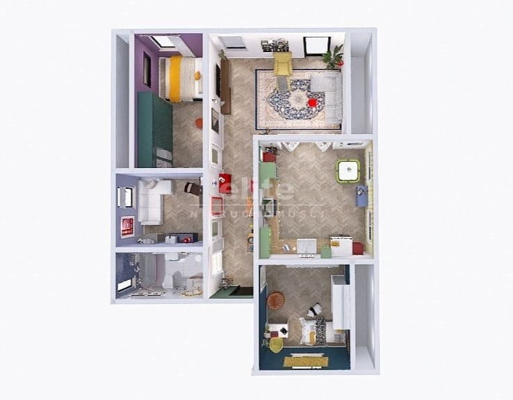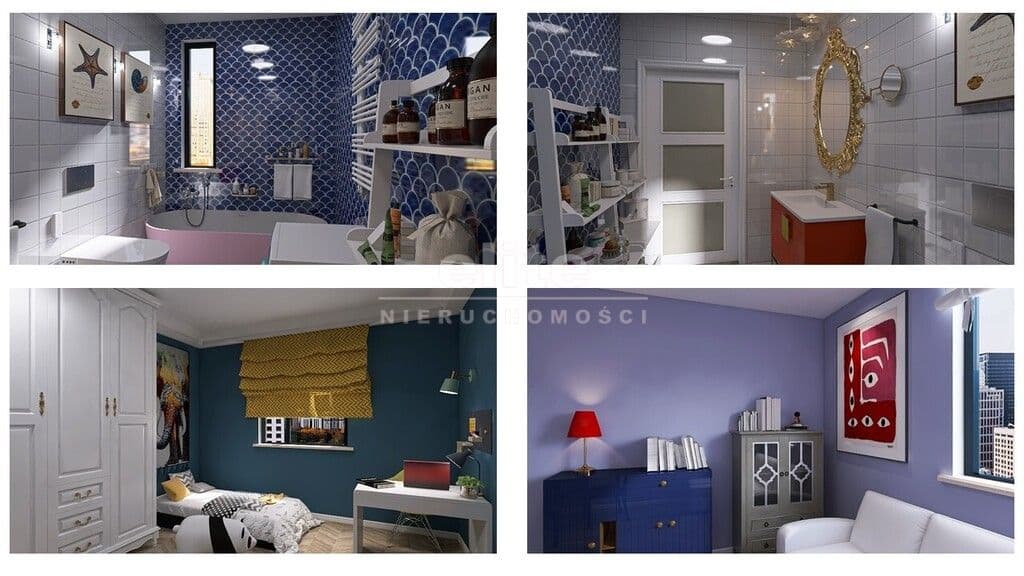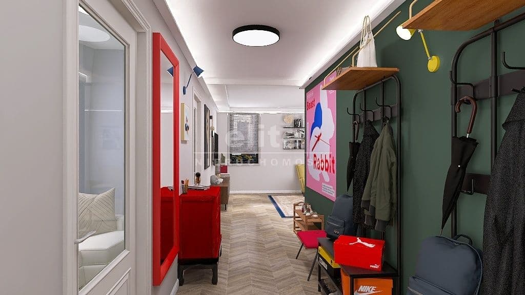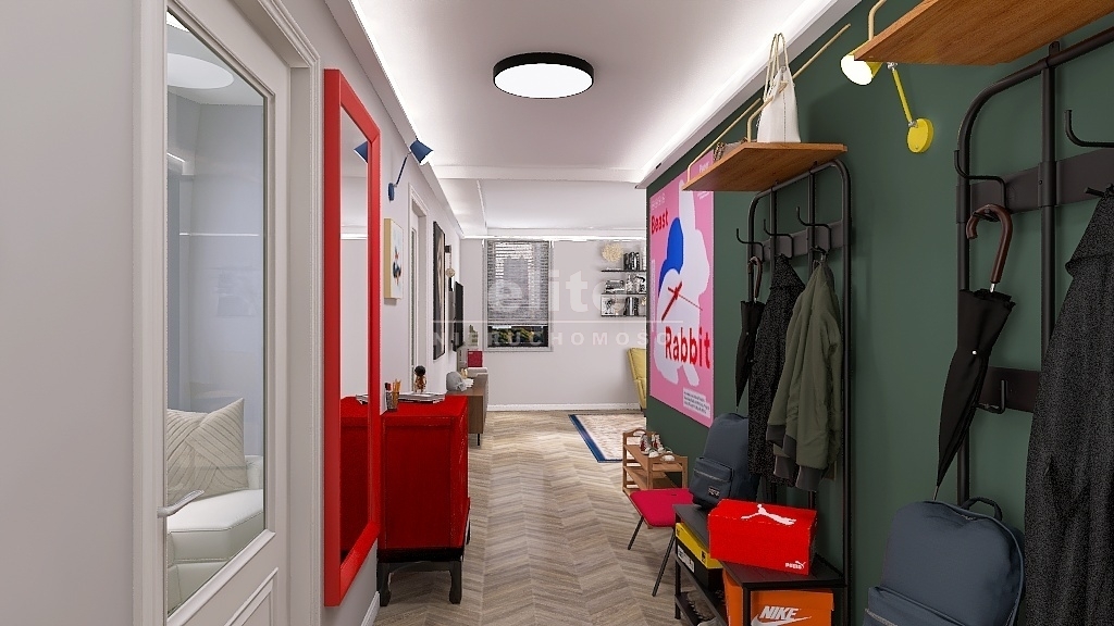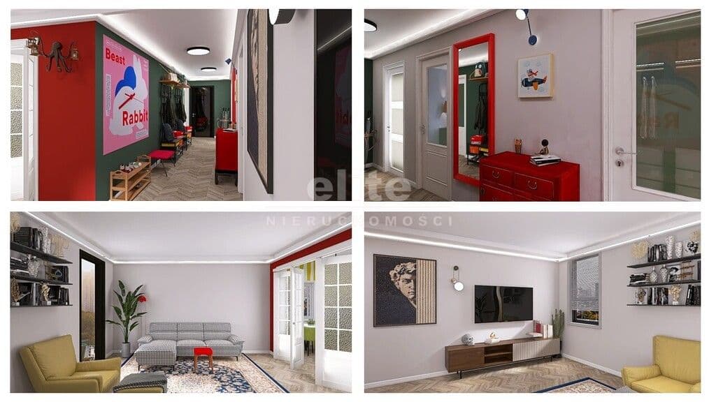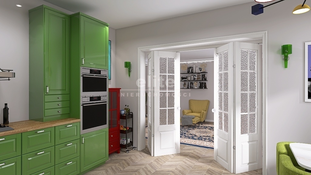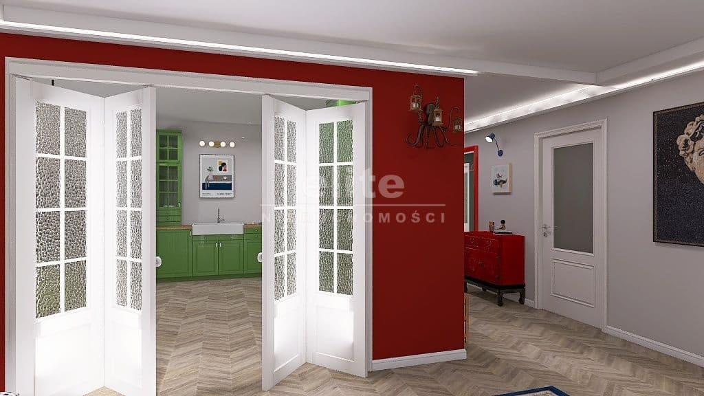 Przy obecnym układzie mamy klasyczny, duży przedpokój z którego wchodzi się do łazienki, kuchni, salonu i trzech sypialni, przy czym ta położona obok salonu jest przechodnia (piękne, duże, drewniane drzwi prowadzą do salonu). Jest wiele możliwości aranżacji pomieszczeń – w przykładowej wizualizacji wykorzystano koncepcję w której kuchnia zostaje przeniesiona właśnie do tej sypialni otwierając się na salon.