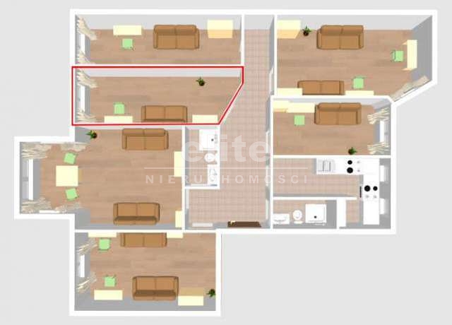 Jest to mieszkanie z 6 niezależnymi pokojami z 2 łazienkami z wc, umywalkami z lustrami i kabinami prysznicowymi. Duża, widna, umeblowana kuchnia z płytą grzewczą, pralką, mikrofalówką oraz 2 lodówkami; każda z zamrażarką. Kuchnia jest wyposażona także w naczynia, suszarkę do naczyń oraz czajnik i toster. W mieszkaniu do dyspozycji najemców 2 suszarki na ubrania, żelazko, mop. Mieszkanie czyste, zadbane.